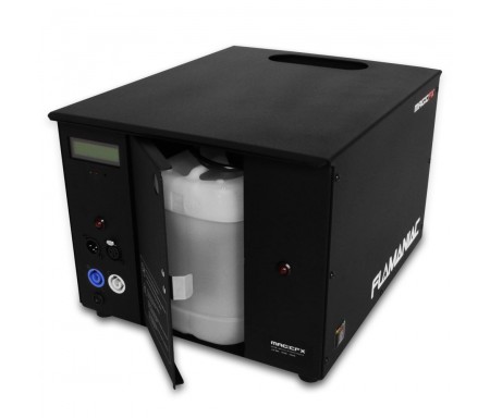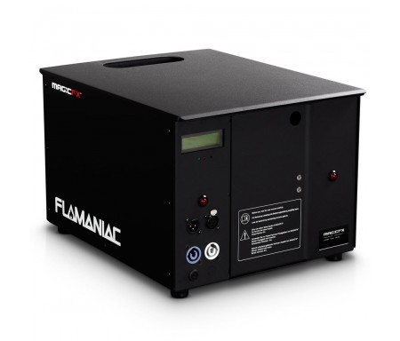 La máquina de fuego Flamaniac de la marca MAGIC FX es un lanzallamas que puede disparar llamas en 5 direcciones diferentes de hasta 6 metros de altura. No necesita cargas de presión externa para funcionar. Es un sistema preparado para conectar a la luz, poner el liquido y funcionar. Dispone de 4 colores diferentes de llamaradas. Con una garrafa de 2,5 litros se pueden hacer unas 300 llamaradas. La Flamaniac se controla a traves de DMX y utiliza 6 canales. El primer canal es un canal de seguridad y los otros 5 son para disparar la Flamaniac. Con la máquina viene incluido el powercon y el mando a distancia que sirve para programar la máquina y cambiar las direcciones. Se recomienda leerse el manual antes de ponerla en funcionamiento.